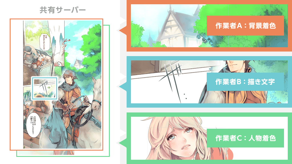 複数人でページごとに分担する作業を管理しやすくなります。Dropboxなどのストレージサービスを活用しながら、どのページを誰が編集中であるかを管理でき、誤って上書きしてしまうといった作品ファイルを共有した際のトラブルを防ぐ設定を行えます。また、作業ログの確認やコメントのやり取りもできます。
