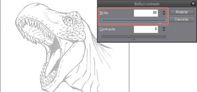 En SAI, dirígete al menú [Filtro] > [Brillo y Contraste]. Aquí ajusta el [Brillo] con el deslizador hasta que el papel quede en un tono blanco que te guste y acepta los cambios. Aunque ten cuidado, pues si aumentas demasiado el brillo podrías perder las líneas.