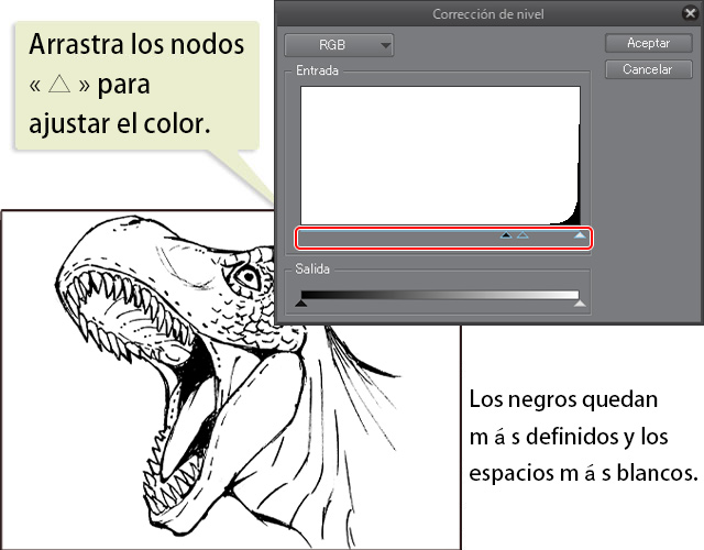 Arrastra los nodos (▲) de la parte inferior del gráfico hacia la derecha o hacia la izquierda, dependiendo de lo que necesites. Con esto puedes blanquear el color y las sombras del papel, así como oscurecer o cambiar el grosor de las líneas.