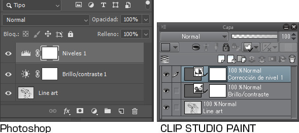 Lo primero es ajustar el color usando una capa de corrección tonal. ● Brillo/contraste Aumenta el brillo de la imagen mediante la función [Brillo/contraste]. En Photoshop: Menú [Capa] > [Nueva capa de ajuste] > [Brillo/contraste] En CLIP STUDIO PAINT: Menú [Capa] > [Nueva capa de corrección] > [Brillo/contraste] En la nueva ventana, ajusta el [Brillo] con el deslizador para que el fondo del papel sea lo más blanco posible, pero sin perder demasiados detalles del line art por el camino.