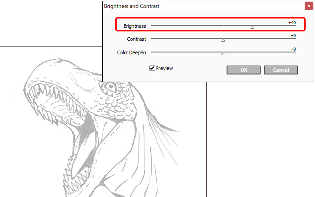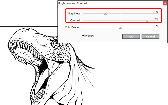 Esta vez, ajusta los deslizadores de [Contraste] y [Brillo] para oscurecer las líneas. Mientras lo haces, ten cuidado de no aumentar en exceso el grosor original de las líneas.