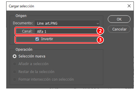 Aquí pasaremos el blanco a transparente por medio de los canales alfa. Con esta función es posible extraer transparencias, usar las selecciones como si se tratasen de máscaras de edición y guardar Nota: Las funciones de los canales alfa no están disponibles en Photoshop Elements. ● Recorte del line art Lo primero es recortar el line art del lienzo.- Ve al menú [Selección] > [Todo].