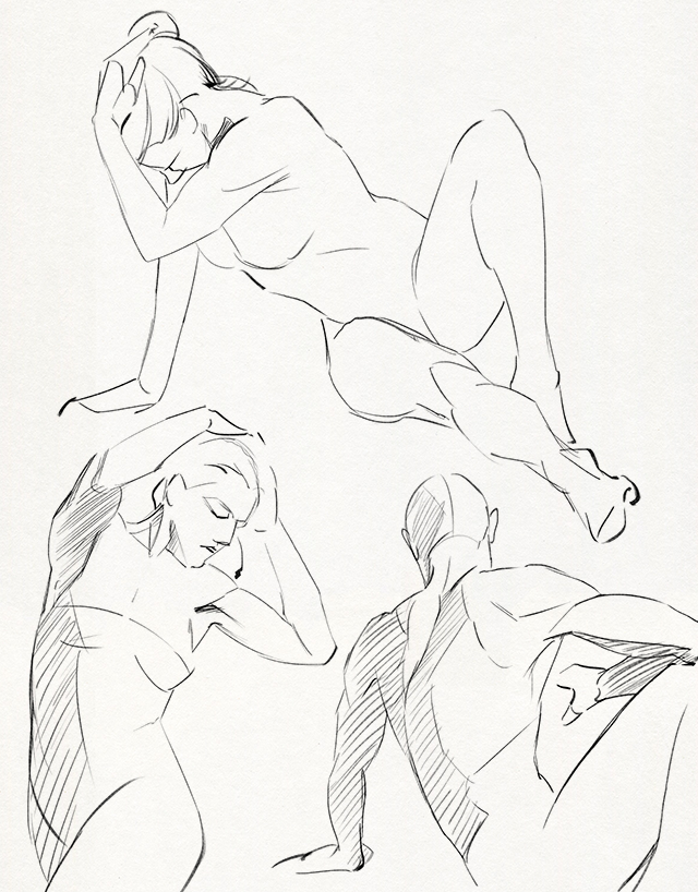 Para abocetar algo en un corto periodo de tiempo, la clave es reducir los detalles complejos del cuerpo humano convirtiéndolos en elementos más sencillos y centrarnos en captar exclusivamente los elementos esenciales de la figura, como pueden ser la proporción, el movimiento, el equilibrio o el estado de ánimo. No se necesita ninguna herramienta en especial para hacer bocetos rápidos, así que puedes practicar con un lápiz y un bloc de dibujo. Haciendo de estos bocetos una práctica regular lograrás mejorar como dibujante, ya que te ayudará a reconocer y dibujar más rápidamente los elementos clave de aquello que estás viendo.