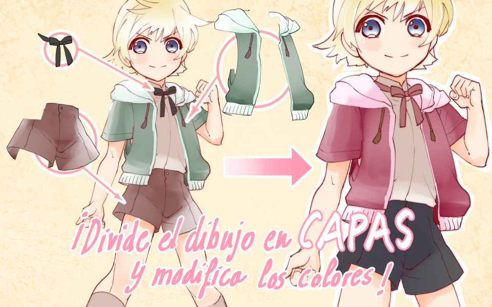 En el arte digital, normalmente se divide el dibujo por capas: una para el personaje, otra para la ropa, otra para los accesorios, etc. De hecho, también se subdivide la capa del personaje en más capas: una para la cara, otra para el cuerpo, el pelo, los ojos, etc. Al estar cada parte en una capa separada, podemos editar esa área en específico sin que afecte a las demás. Por ejemplo, si la cara y el pelo y la cara de tu personaje se encuentran en capas distintas, puedes corregir el pelo sin necesidad de tener cuidado con el rostro. Hasta puedes cambiar en un momento el color de la ropa sin que afecte a nada más.
