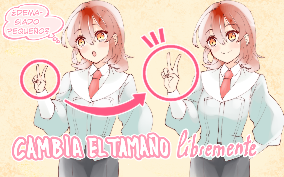 ¡Todos la fastidiamos más de una vez al dibujar! Es normal. Sin embargo, y esta es una de las mayores ventajas del arte digital, estos fallos los puedes corregir en un momento con el botón de Deshacer de los programas de dibujo. Además, puedes ajustar y guardar las propiedades de tus herramientas de dibujo, como el grosor de los trazos. También existen otras funciones superútiles en la mayoría de aplicaciones de dibujo, como el escalado, la rotación o la modificación de aspectos como el brillo y el contraste. Con todo esto y mucho más, puedes mejorar fácilmente tus dibujos de formas inimaginables en el arte tradicional. Por ejemplo, puedes equilibrar el cuerpo de un personaje modificando el tamaño de sus manos, pies u ojos, como se muestra en la siguiente imagen.