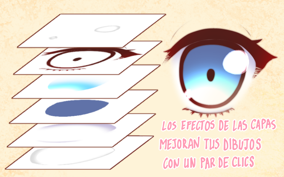 Otra gran ventaja de la ilustración digital es la capacidad que nos brinda para dar distintos efectos a las capas. Fijémonos en el ejemplo de la imagen. Para crear el ojo, hemos añadido varias capas de pintura: una con el efecto Multiplicación para las cejas, otra con Brillo para los reflejos, etc. ¡Todo esto da como resultado unos ojos llenos de detalles! Hasta podrías añadir algunas capas con tonos rojos o púrpuras para darle más profundidad.