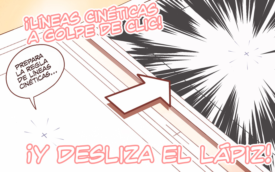 Las líneas cinéticas atraen la visión del lector y te ayudan a fortalecer la escena. Con los programas de dibujo, puedes editar su tamaño y su grosor tanto como quieras. También puedes comprar directamente el tipo de línea cinética que buscas (color, forma…) en webs de materiales para acelerar tu trabajo.