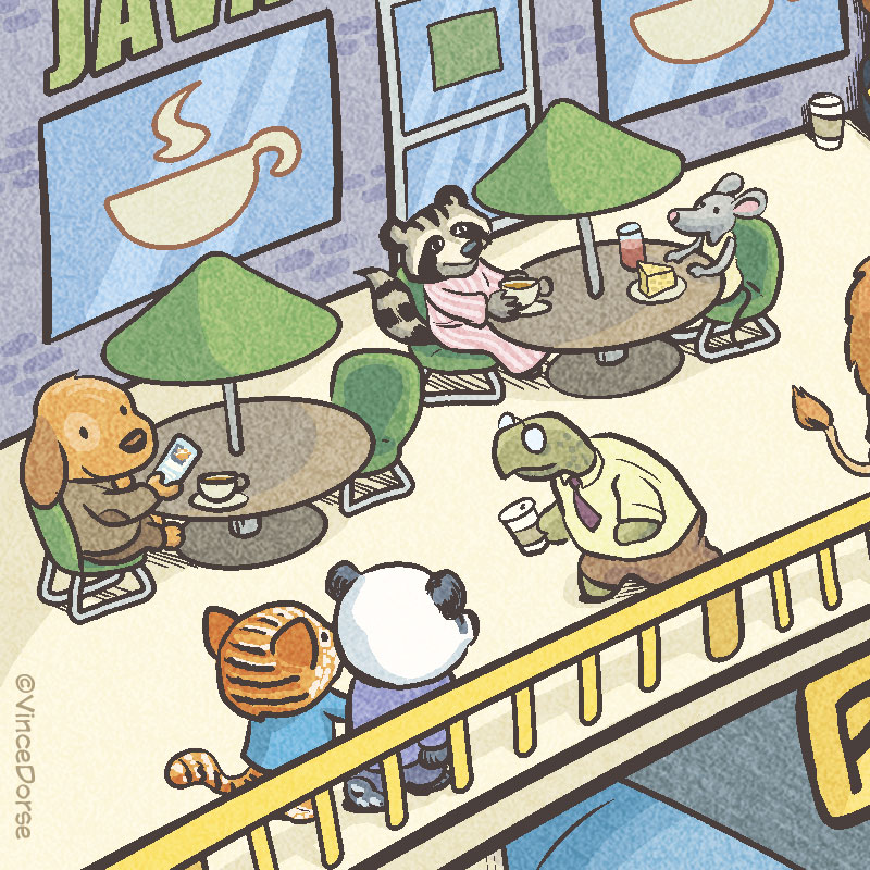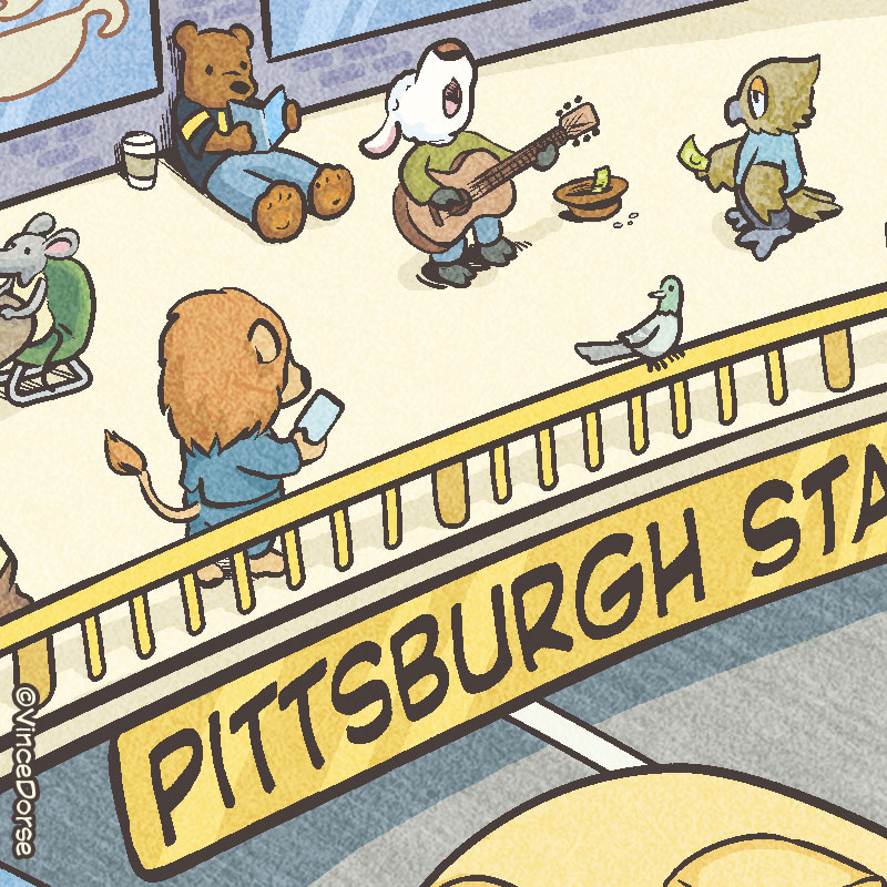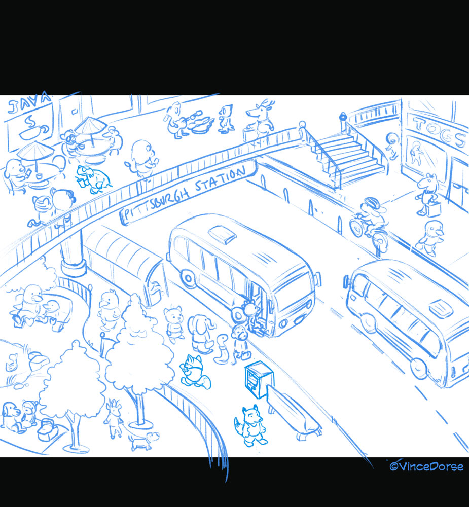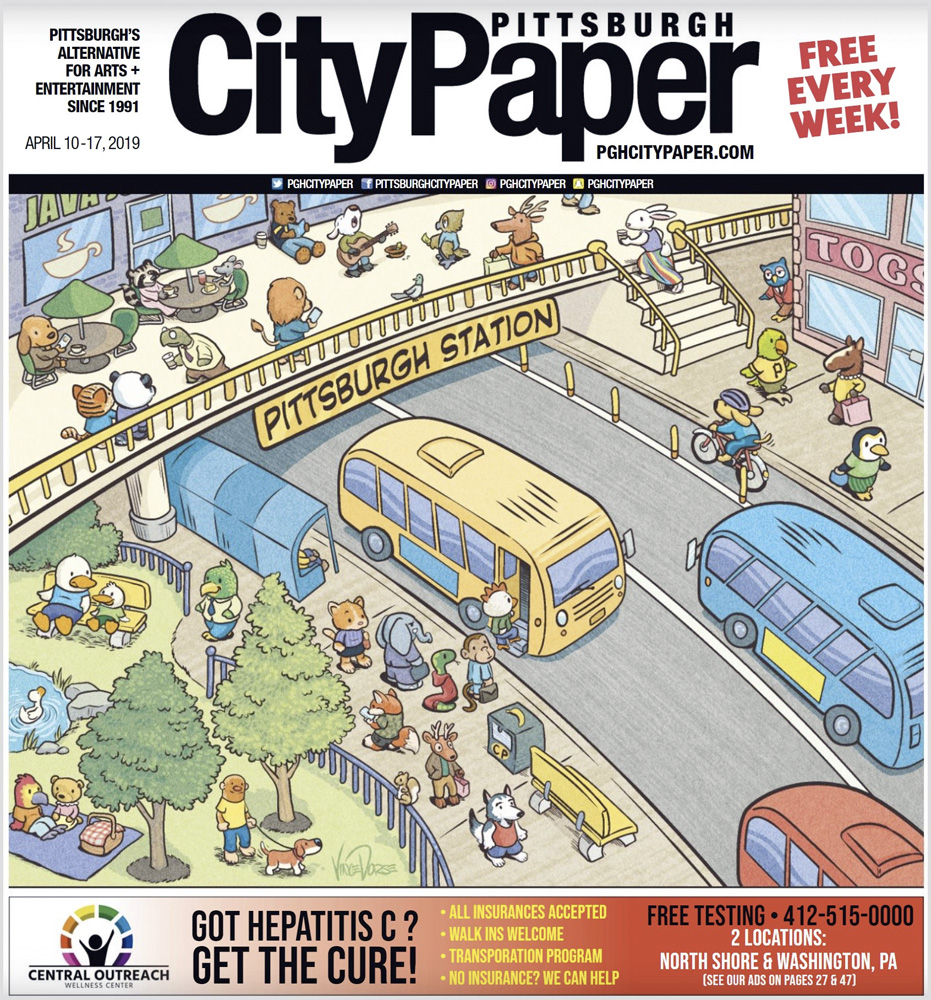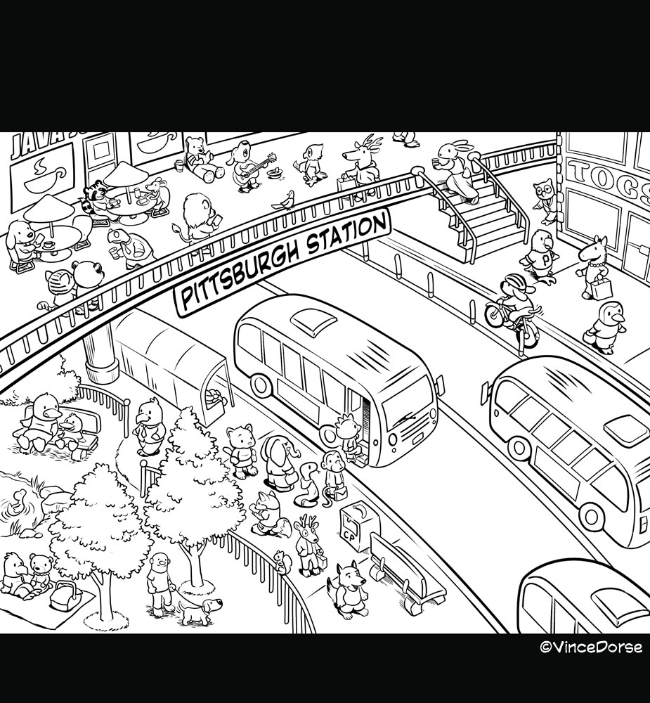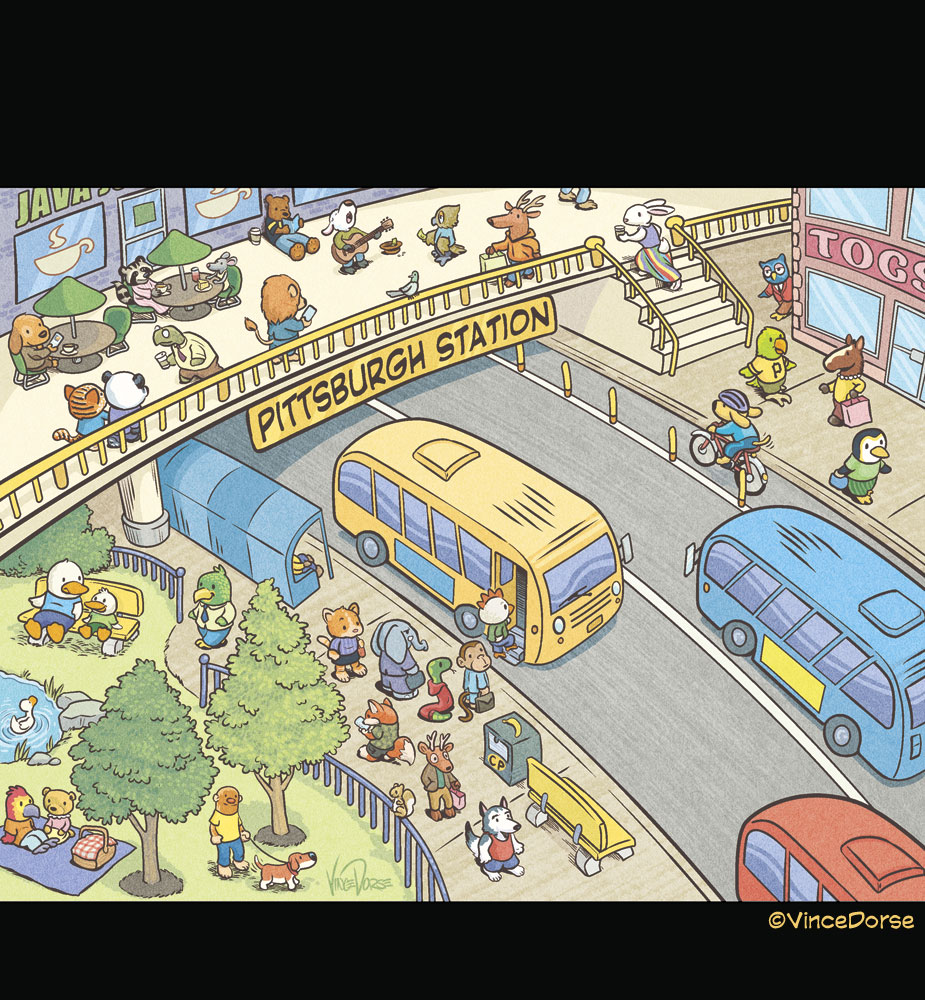 Este es uno de los dibujos que más he disfrutado haciendo. Lisa, la editora del City Paper, quería una ilustración en portada que acompañara a su reportaje sobre los autobuses de Pittsburgh. Buscaba emular la nostalgia infantil que evocan los libros de Richard Scarry con sus animales antropomorfos haciendo vida diaria.