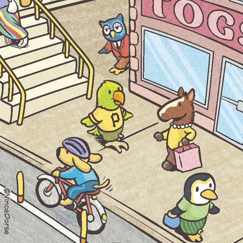 Dado que el City Paper fue tan amable conmigo al hacerme este encargo, no podía quedarse sin su propio dispensador de periódicos en el dibujo. Aproveché también para dejar un plátano sobre él, algo que parece haber captado la atención del mono de la imagen. Ah, casi me olvido del pollo. En un principio, lo dibujé cruzando la acera, pero en el periódico les gustaba más así. No hay cruces peatonales en las paradas de autobús, así que ahora el pollo está subiendo a este. Supongo que hay varias formas de cruzar la carretera…
