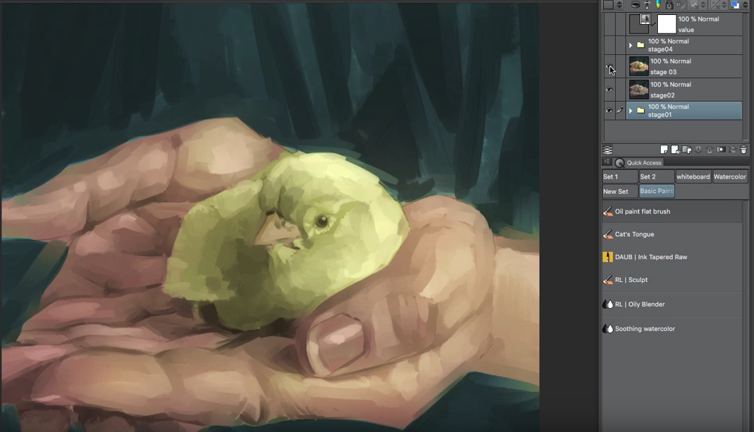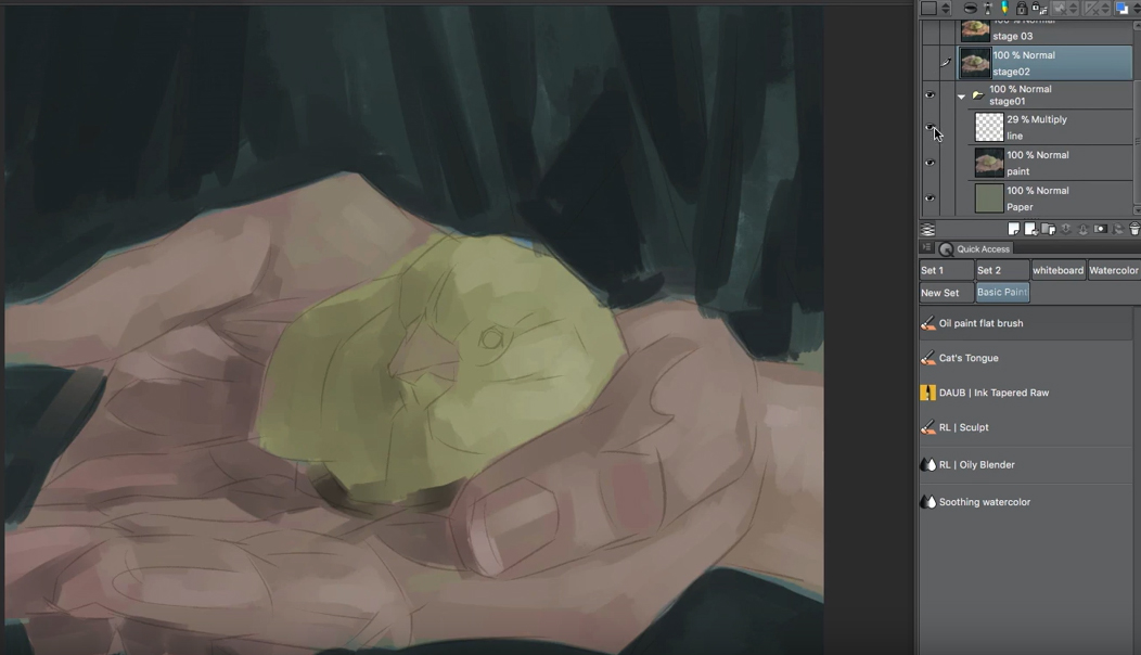 Para esta imagen en particular, he aplicado los colores con el pincel plano al óleo estándar de CLIP STUDIO PAINT. Adoro este pincel: sus resultados son inmediatos, es fácil de controlar y sé exactamente lo que hará en cada pincelada.