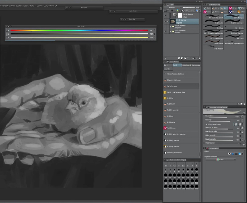 Cuando quiero iluminar u oscurecer mi dibujo, ajusto los valores HLS y no los HSV. Una de las razones por las que adoro CLIP STUDIO PAINT es precisamente el deslizador HLS. Es una pena que Photoshop carezca de este, ya que me encanta cómo funciona el algoritmo de luminosidad de HLS cuando estoy ajustando los valores de color. Una vez que termino, elimino la capa de valor (tono y saturación). Nunca deja de sorprenderme lo bonitas que quedan mis imágenes después de ajustarlas.