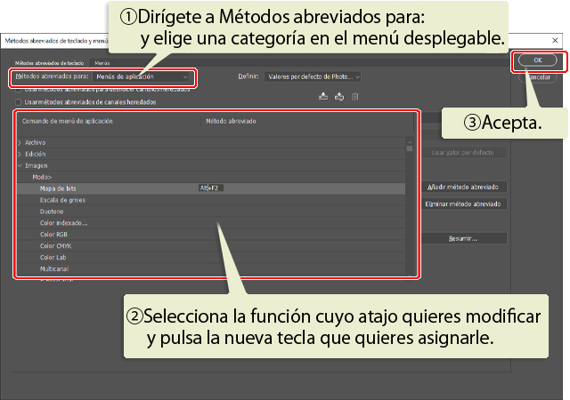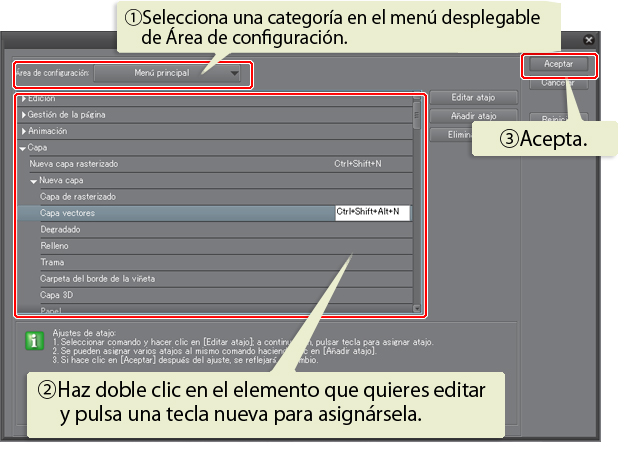 (2) Selecciona la función cuyo atajo quieres modificar y pulsa la nueva tecla que quieres asignarle.