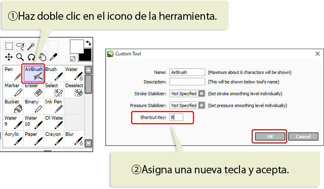 Si quieres asignar una tecla a una herramienta, haz doble clic sobre ella para abrir la ventana de Herram. personalizada. Asigna la tecla en Tecla de atajo y acepta.