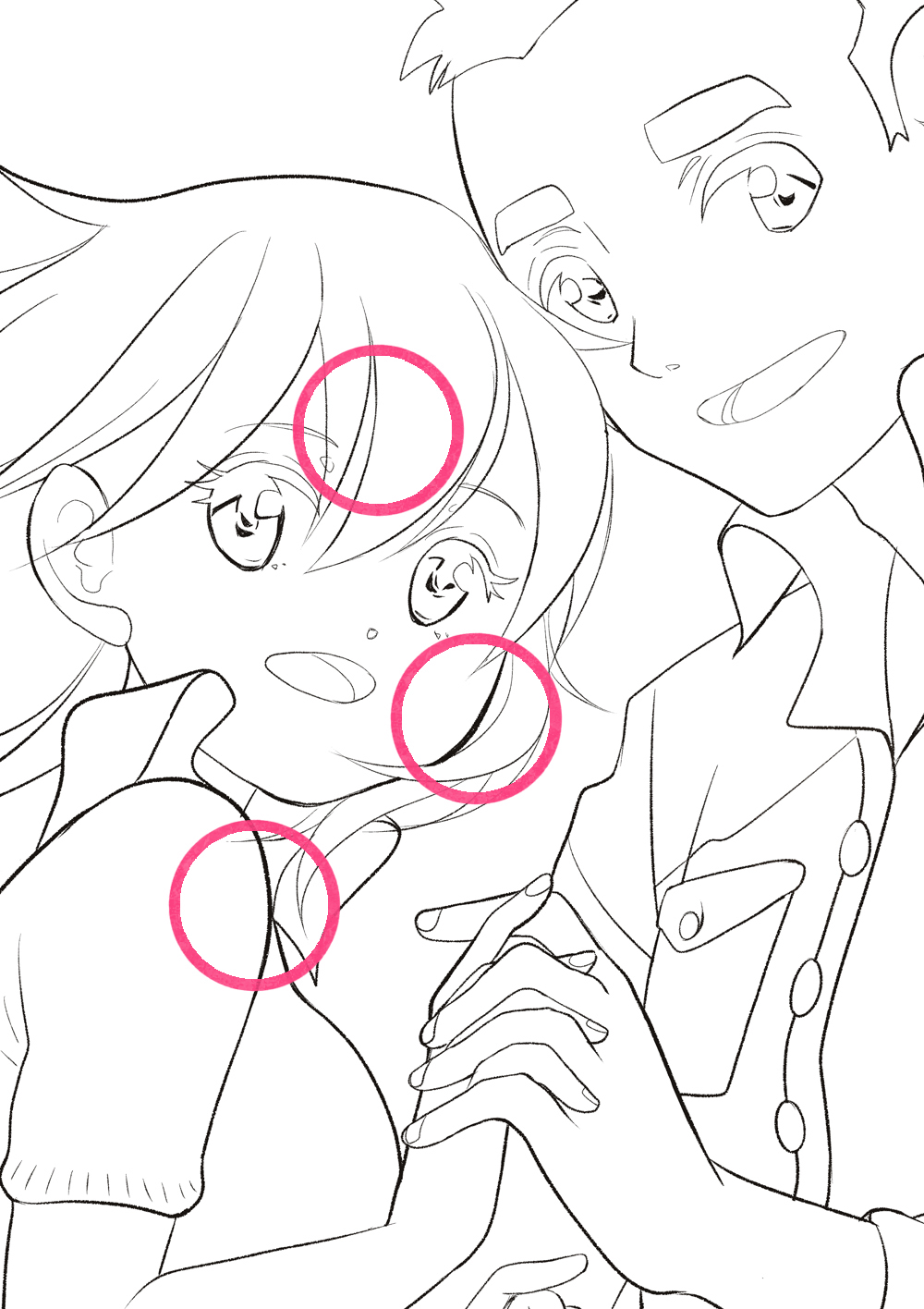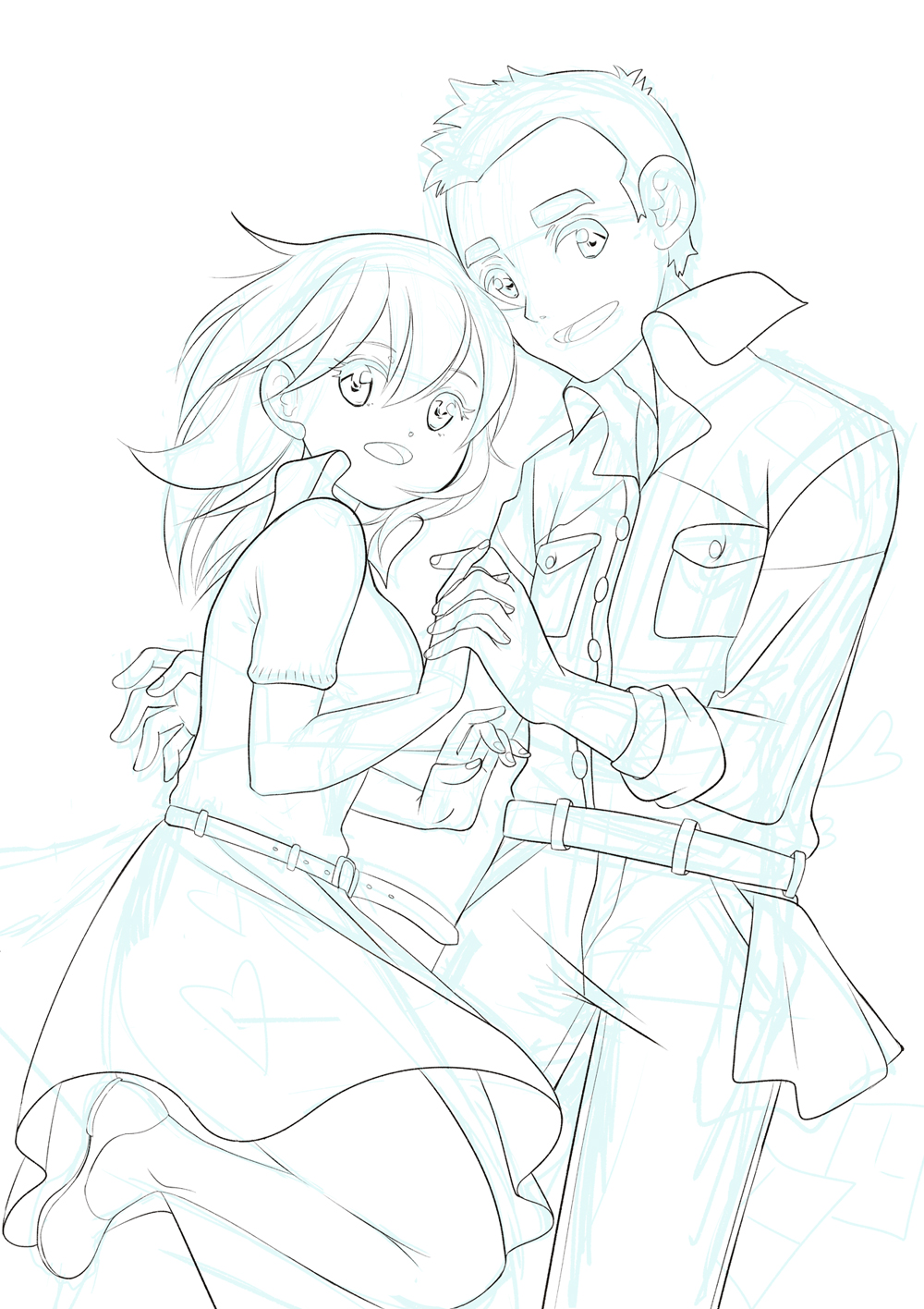 Para esta pareja de tortolitos, intenté que el line art de la chica fuese mucho más suave que el del chico, a quien añadí varias líneas rectas e irregulares.