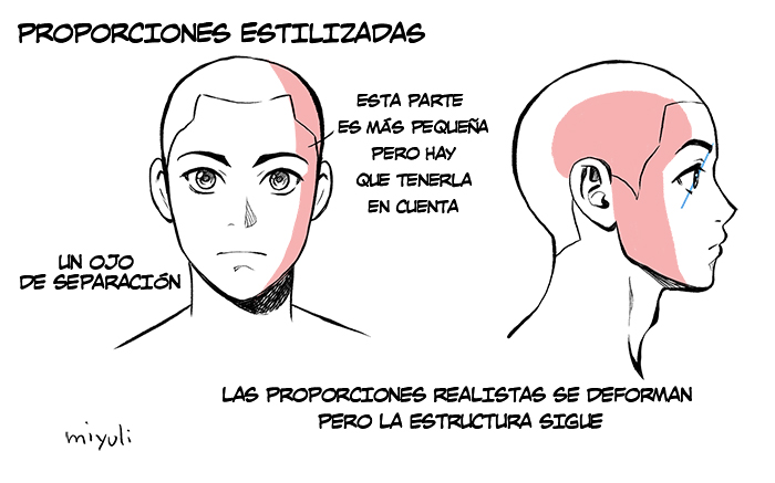Las proporciones estilizadas se basan en las realistas, así que se pueden utilizar los mismos puntos de referencia y luego ir deformándolos según el estilo. Aunque exageremos el tamaño de los ojos, debemos respetar la estructura tridimensional. Esta es la regla básica para conseguir tridimensionalidad en los ojos y poder imaginarlos desde varios ángulos.