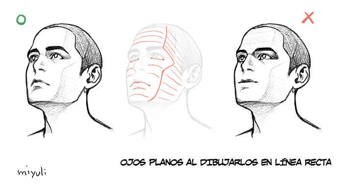 Si dibujamos los ojos siguiendo una línea recta, tendremos como resultado unos ojos planos. Al no descansar sobre un plano recto los ojos siempre se inclinan en el rostro.