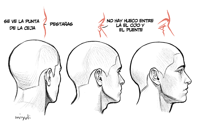 Cuando la figura está más girada que de 3/4, casi de perfil, pueden sobresalir la punta de la ceja y de la pestaña. Al ir girando el rostro, desaparece el espacio entre el ojo y el puente, indicándonos un cambio notable en la dirección a la que mira el rostro antes de quedar completamente de perfil.