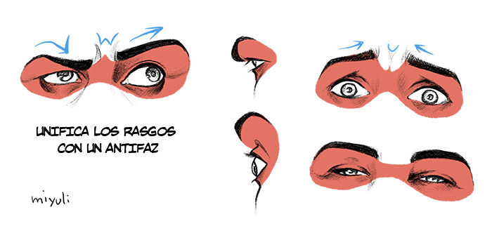 Una técnica que nos puede ayudar a unificar los rasgos de los ojos es imaginarnos un antifaz, así no los pondremos flotando por la cara. También es más fácil imaginarse la vista del antifaz desde distintos ángulos. Los rasgos tienen que guardar relación unos con otros para poder transmitir mejor las emociones.