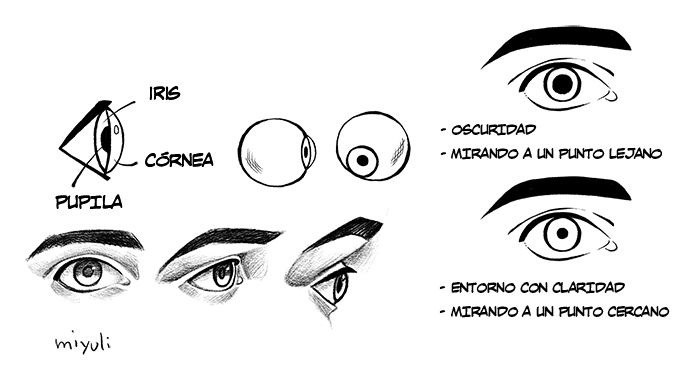 Piensa bien lo que necesitas. Los ojos más sencillos vienen mejor para animación o estilos que buscan el movimiento. Para una ilustración o un primer plano, se pueden hacer más detallados.