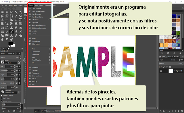 Las funciones disponibles para la edición fotográfica son muy similares a las de otros programas de pago con el mismo propósito, lo que lo convierte en una muy buena opción para corregir el color de nuestras ilustraciones. GIMP se desarrolló con la intención de ser un software de procesamiento de imágenes y fotografías destinadas a la publicación online, por lo que no es una opción recomendable si vas a imprimir las imágenes o a usarlas en un vídeo.