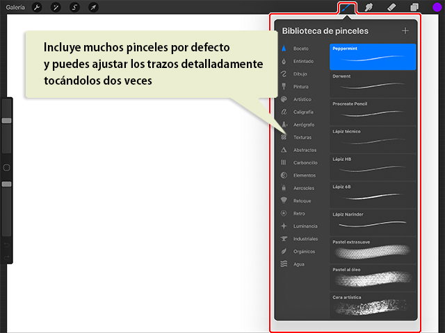 Procreate contiene muchas funciones exclusivas de medios digitales, como personalización de los pinceles, reglas de perspectiva, máscaras de recorte y herramientas de texto y animación. Al iniciar la aplicación, aparece un vídeo muy informativo que explica cómo usarla y una imagen de ejemplo de alta resolución.