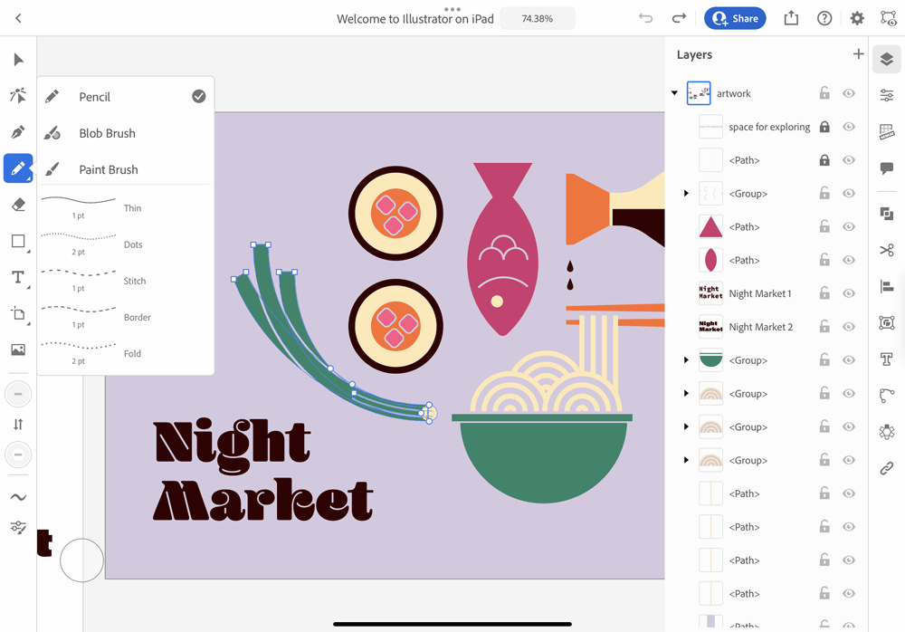La versión para iPad incluye más de 18 000 tipos de fuente y 20 paletas de colores. Si te suscribes a Adobe Creative Cloud, podrás trabajar sobre tus archivos en Photoshop, Fresco y la versión PC de Adobe Illustrator. Además, los proyectos se guardarán en la nube, por lo que no dependerás de un solo dispositivo para trabajar.