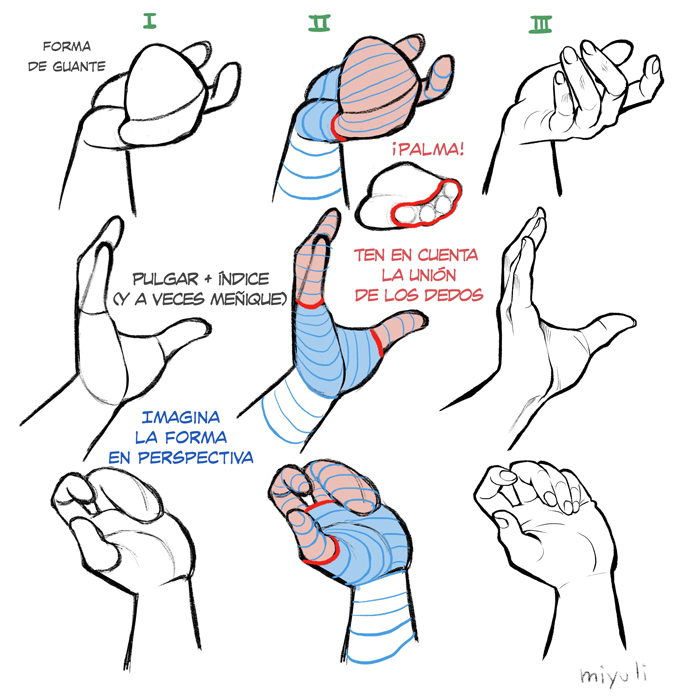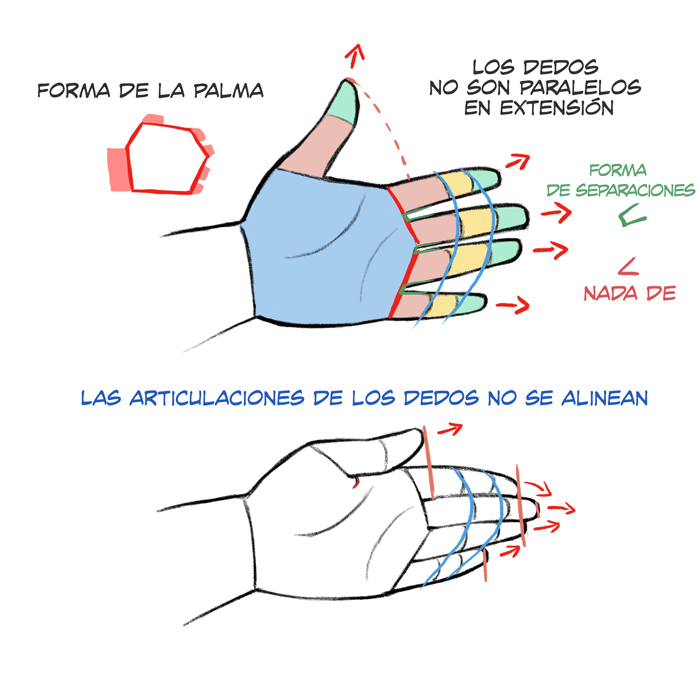 Las formas básicas de la mano no son perfectamente cuadradas ni paralelas, por lo que no resulta difícil equivocarse al dibujarlas. Al extender y separar los dedos, estos apuntan en direcciones distintas. Y debido a que el origen y la longitud de los dedos difieren, las articulaciones tampoco se alinean.