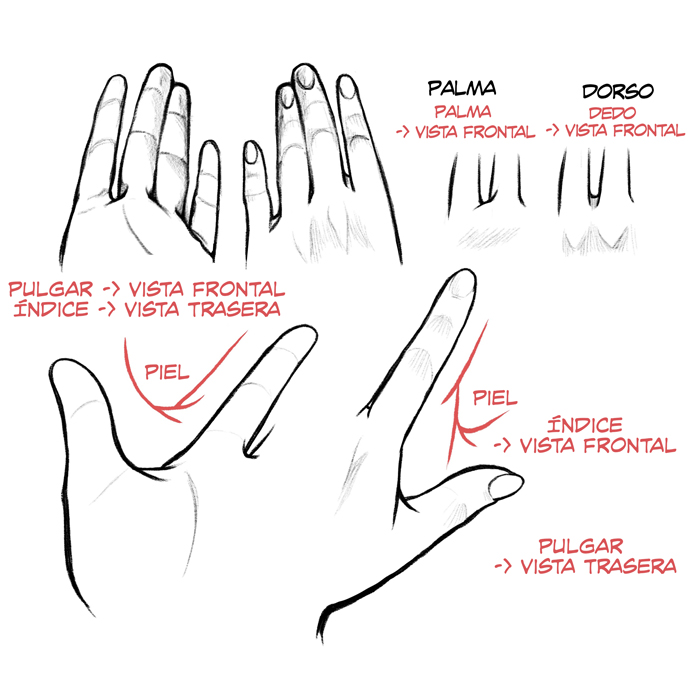 Para posibilitar la flexión de los dedos, la piel es relativamente laxa y fina en las articulaciones, y las arrugas generadas por la flexión no siempre se alinean con estas. Estas líneas se suelen omitir en los dibujos sencillos, pero resulta muy útil conocer dónde se ubican y se superponen a la hora de dibujar dedos doblados.