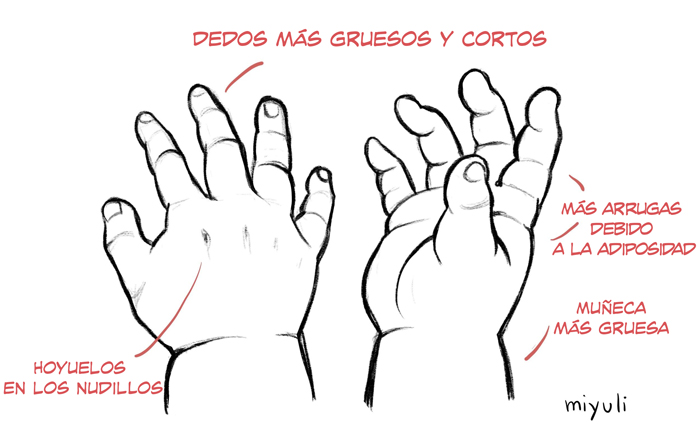 Las manos de los infantes tienen proporciones distintas, lo que hace que los dedos parezcan más gruesos y cortos y la muñeca más ancha. La adiposidad de los bebés forma arrugas alrededor de sus nudillos y articulaciones. Los nudillos del dorso de la mano presentan hoyuelos que desaparecen con la edad, a la vez que los huesos de los nudillos se tornan más prominentes.