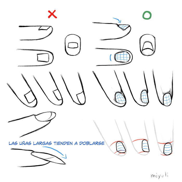 Los dedos de los pies y de la mano se suelen alinear en forma de arco para darles más firmeza y precisión. Intenta resaltar este rasgo siempre que sea posible.