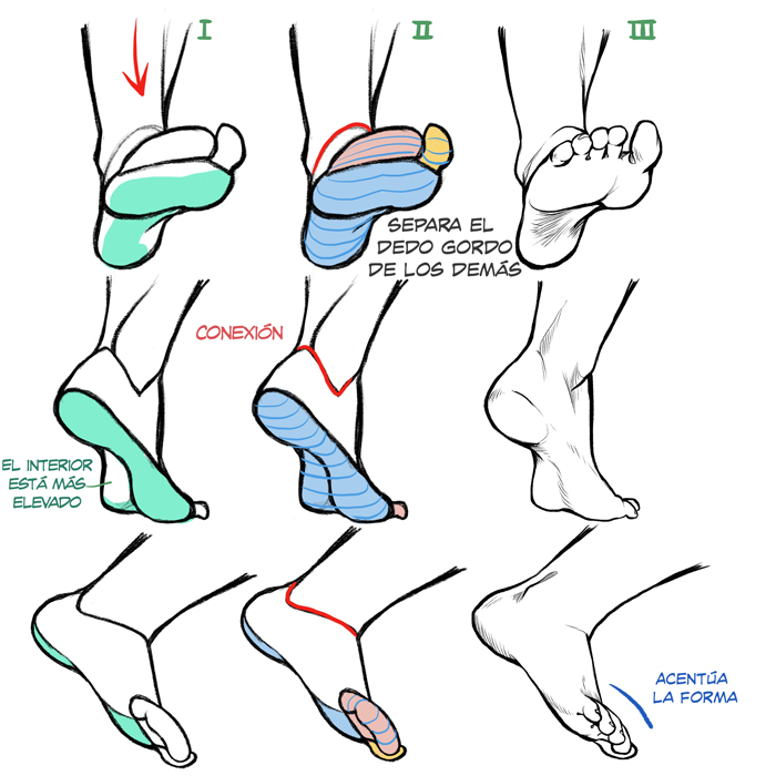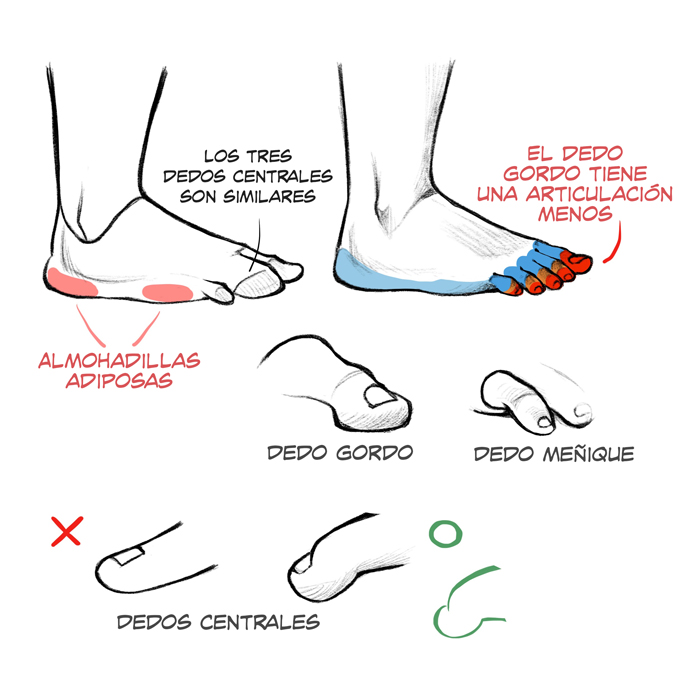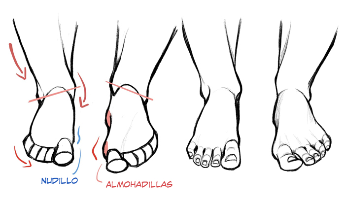 Al igual que a la hora de dibujar manos, es recomendable dividir los pies en formas más simples. El rango de movimiento de los pies es más limitado que el de las manos, ya que se usan principalmente como apoyo y para caminar. Conviene separar el dedo gordo del resto para que sea más fácil dar dinamismo a la pose. La planta puede ser difícil de dibujar en ciertos ángulos. Recuerda que el interior está más elevado y que apenas toca la superficie.