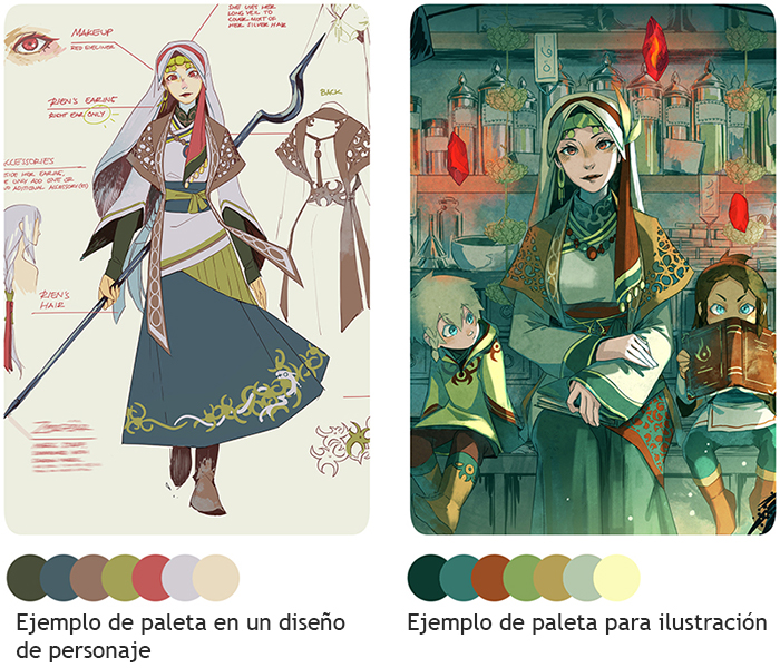 Cuando hablamos de paletas, nos referimos al esquema o la combinación de colores utilizados en la ilustración y el diseño. En diseño, los esquemas de color se usan principalmente para determinar los colores base (colores de los objetos y materiales bajo una iluminación neutra). En ilustración, los esquemas de color se utilizan para expresar y destacar la atmósfera y la ambientación. Los colores del ambiente influyen en los colores base. Por ejemplo, la falda azul grisácea de Rien, el personaje de la izquierda, parece turquesa oscuro en la imagen de la derecha debido a la tonalidad verdosa de la luz ambiental.