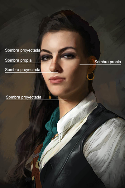 Otro factor importante al tratar la iluminación es saber diferenciar entre las sombras propias y las sombras proyectadas. La sombra propia de un objeto es la que está determinada por la forma cambiante de un objeto. Uno de sus lados queda en sombra. Las sombras proyectadas o arrojadas se proyectan directamente desde otro elemento, como puede ser la misma nariz. Las sombras proyectadas suelen ser más nítidas, mientras que las sombras propias de las formas se envuelven con más suavidad alrededor de estas.
