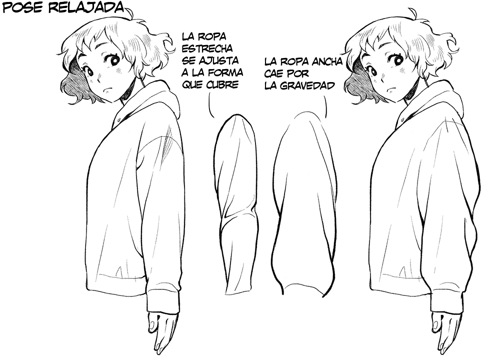 El tejido se adapta al movimiento y a la posición de la forma que cubre, y lo mismo ocurre con las arrugas. Las arrugas pueden ayudarte a enfatizar los movimientos del personaje.