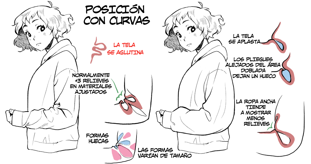 Por ejemplo, el material más ligero y fino del dibujo anterior no presenta tantos pliegues porque el brazo está mayormente relajado.