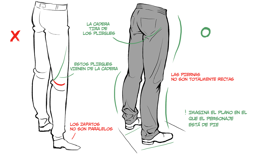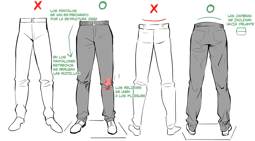 Aunque hay varios tipos de pantalones (anchos, estrechos, skinny, de campana, bombachos…) todos ellos tienen en común que se sujetan en la cintura. En los pantalones estrechos, las arrugas suelen concentrarse en las rodillas y base de las caderas, las partes más móviles. Si dibujas algún pliegue en la tela, debes indicar su origen y volumen. La experiencia visual es muy diferente si ayudas a que el espectador pueda imaginarse los pliegues de forma tridimensional.