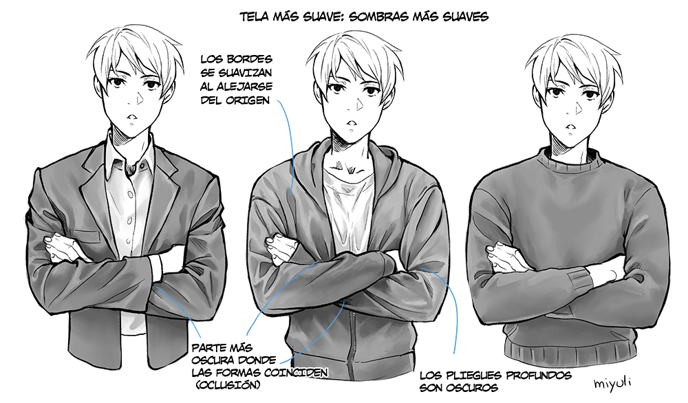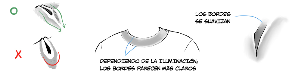 Como se ve en los ejemplos, aunque los bordes de las sombras puedan parecer muy definidos, procura aplicar difuminados en la zona de la sombra que se aleje del punto más profundo del pliegue para añadir realismo.