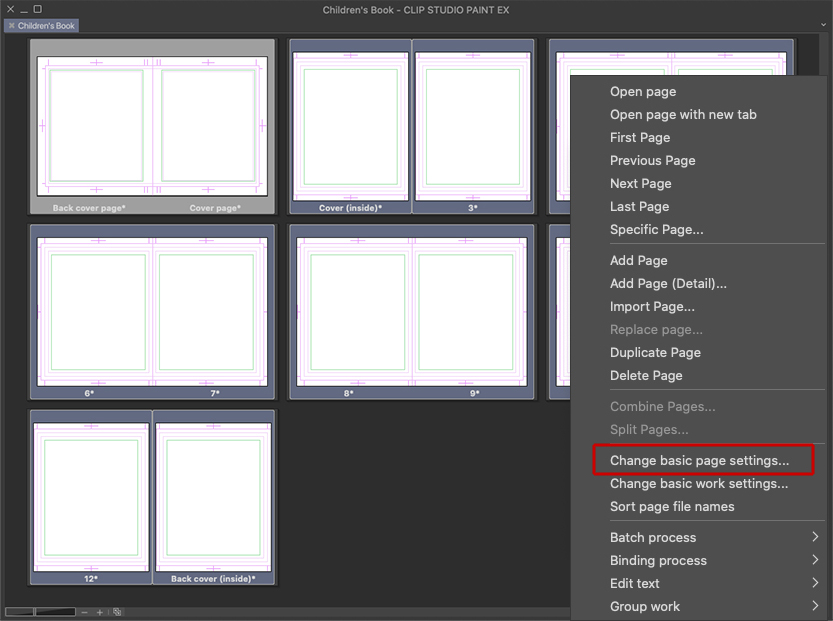 Volveremos de nuevo a hacer la operación anterior, control+clic y seleccionaremos [Change basic page settings], pero esta vez lo haremos únicamente sobre la portada, debemos asegurarnos de que no hay ninguna otra página seleccionada.