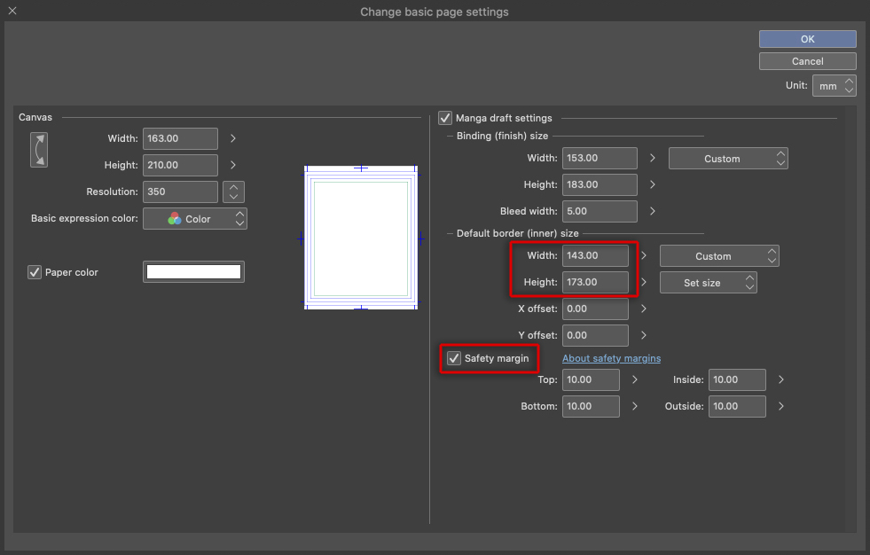 El [Default border (inner) size] al que le daremos un centímetro menos del tamaño de nuestra página, tanto de ancho como de alto y el [Safety margin] donde le daremos un valor de 10mm.
