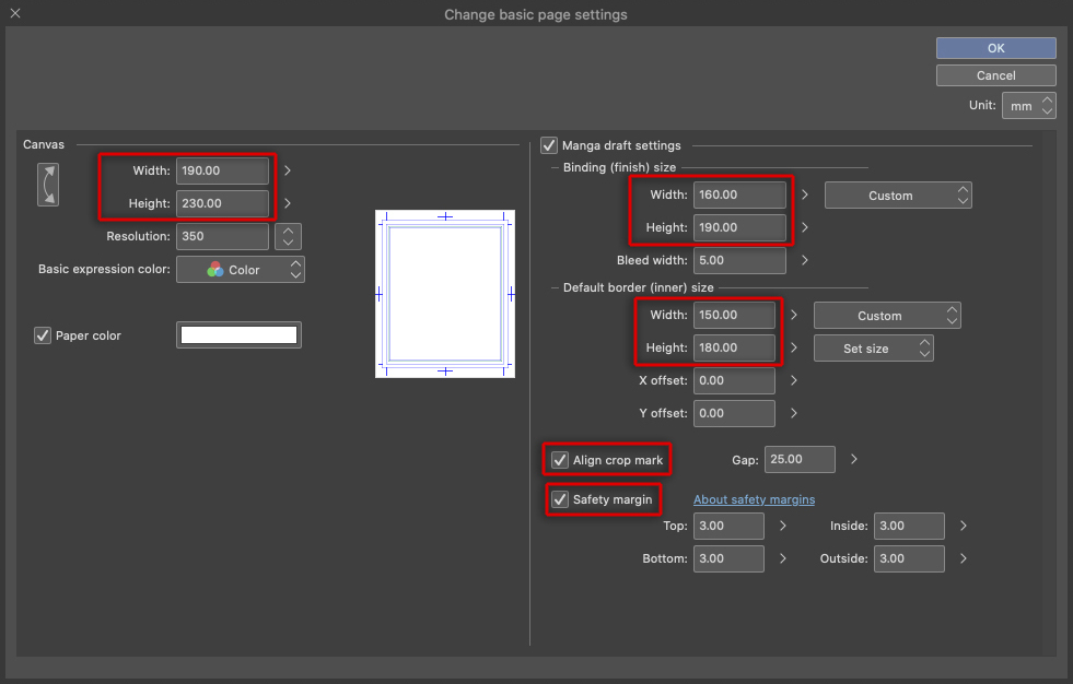 Si vuestra portada y vuestro interior tienen el mismo tamaño podéis saltaros este paso, de lo contrario pondremos las medidas de nuestra portada en el apartado [Binding (finish) size] en la parte superior derecha de la ventana, dejando los 5 mm de sangre, justo debajo cambiaremos el [Default border (inner) size] restándole un centímetro tanto de alto como de ancho. A la derecha de la ventana, le añadiremos un par de centímetros más a nuestro lienzo para poder trabajar con holgura y darle espacio a la sangre y las líneas de corte.