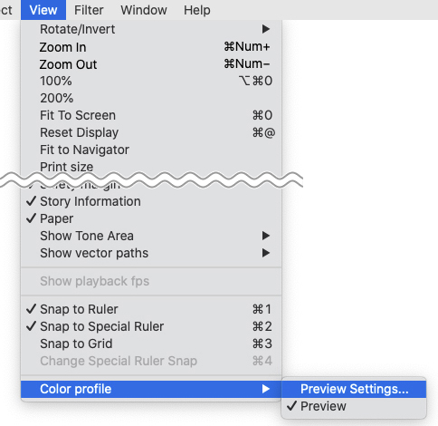 Puede que en vez de querer imprimir nuestro libro queramos simplemente hacer su versión digital, un EPUB (Publicación Electrónica), o puede que queramos hacer ambas cosas. Si desde el principio sabemos que sólo queremos la versión digital podemos crear las ilustraciones en RGB, si no, podemos ir a la ventana [View] – [Color profile] – [Preview settings] y cambiar de nuevo el modo de color en el menú desplegable antes de exportar la versión EPUB tal y como hemos hecho antes.