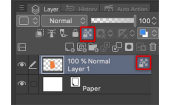 A partir de ahí el proceso es sencillo, se bloquea la capa de color en la ventana de capas, activando [Lock transparent pixels], nos aparecerá el símbolo en la capa en la que lo hemos activado, y a partir de ahí podemos colorear las diferentes partes del dibujo sin que coloreemos fuera de la forma ya creada previamente.