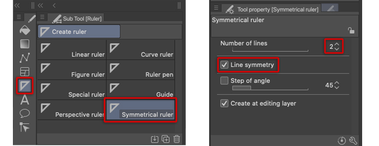 Un truco para hacer con más facilidad y perfección ciertos elementos simétricos es utilizar la regla de simetría de CSP. Iremos a la herramienta de la parte izquierda [Ruler] y seleccionaremos [Symmetrical ruler], es importante que el número de líneas sea 2 y de que la casilla [Line symmetry] está seleccionada en las propiedades de la herramienta.