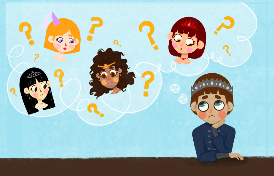 - En el primer par de páginas ilustramos al príncipe pensando en todas las supuestas princesas que conoció en sus viajes por el mundo.