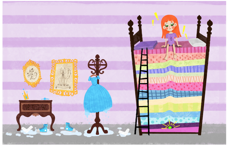 - En el tercero, a la princesa sobre su cama preguntándose qué es aquello que no la ha dejado dormir.