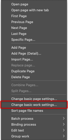 Tal y como hicimos antes, haremos Comando+clic sobre una de las miniaturas de la página y en el menú que se muestra seleccionaremos [Change basic work settings].