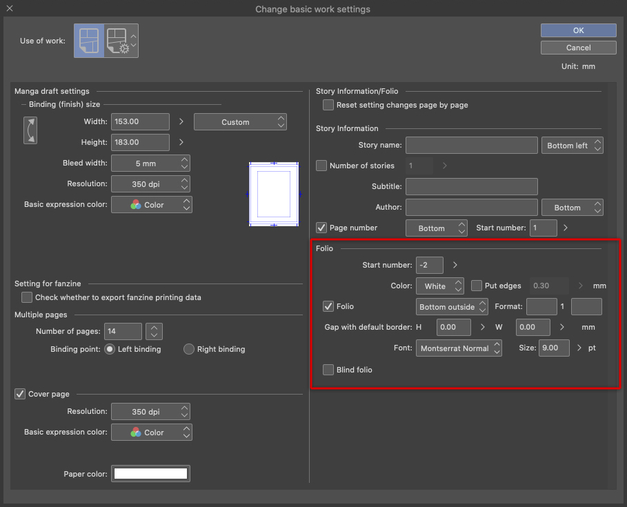 Se nos abrirá la ventana con los ajustes del libro donde tan sólo cambiaremos el último apartado [Folio], dejando todo lo demás tal y como está.