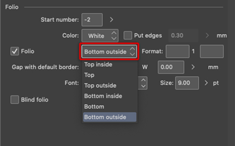 Si queremos que el paginado empiece a contar desde la portada, en [Start number] deberemos poner un 1, como queremos que comience desde nuestra primera ilustración escribiremos -2, ya que contará de la siguiente forma: Portada exterior -2, portada interior -1, página en blanco 0 y nuestra primera ilustración será la número 1.