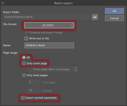 Iremos al menú [File] – [Export multiple pages] – [Batch export] y se abrirá la siguiente ventana donde podremos elegir el formato en el que queremos exportar las imágenes desplegando el menú en [File format], es recomendable hacerlo en TIFF.