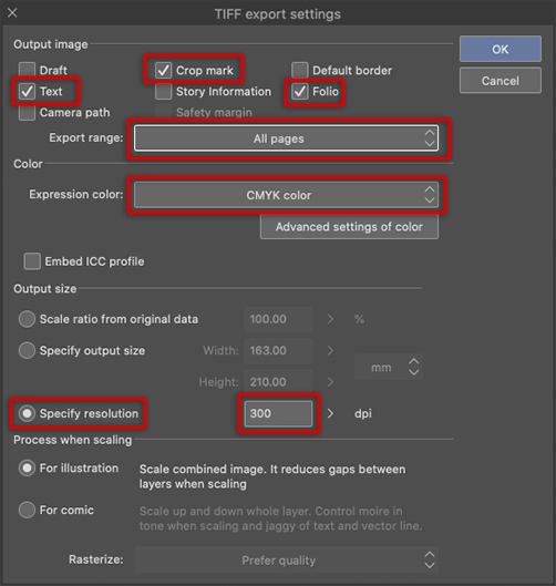 Le añadiremos 5mm de sangre, que servirá para que no haya espacios en blanco en los bordes una vez imprimamos el libro. Y por último en [Basic expression color] seleccionaremos la opción [Color].